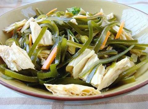 将腐竹、海带丝、胡萝卜丝放入碗中,加盐、醋、蘑菇精、香油拌匀即可。如果喜欢,还可以放少许芥末和芝麻酱
